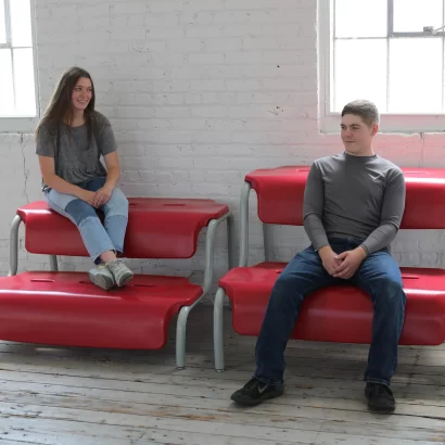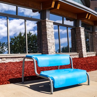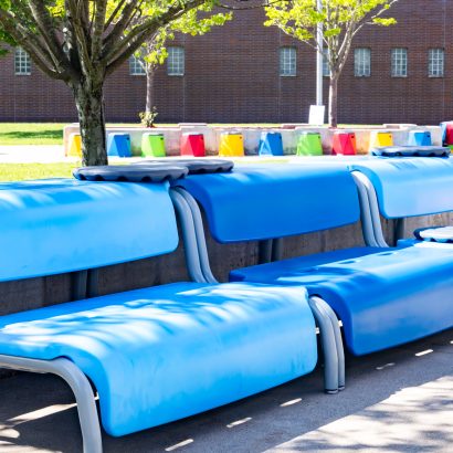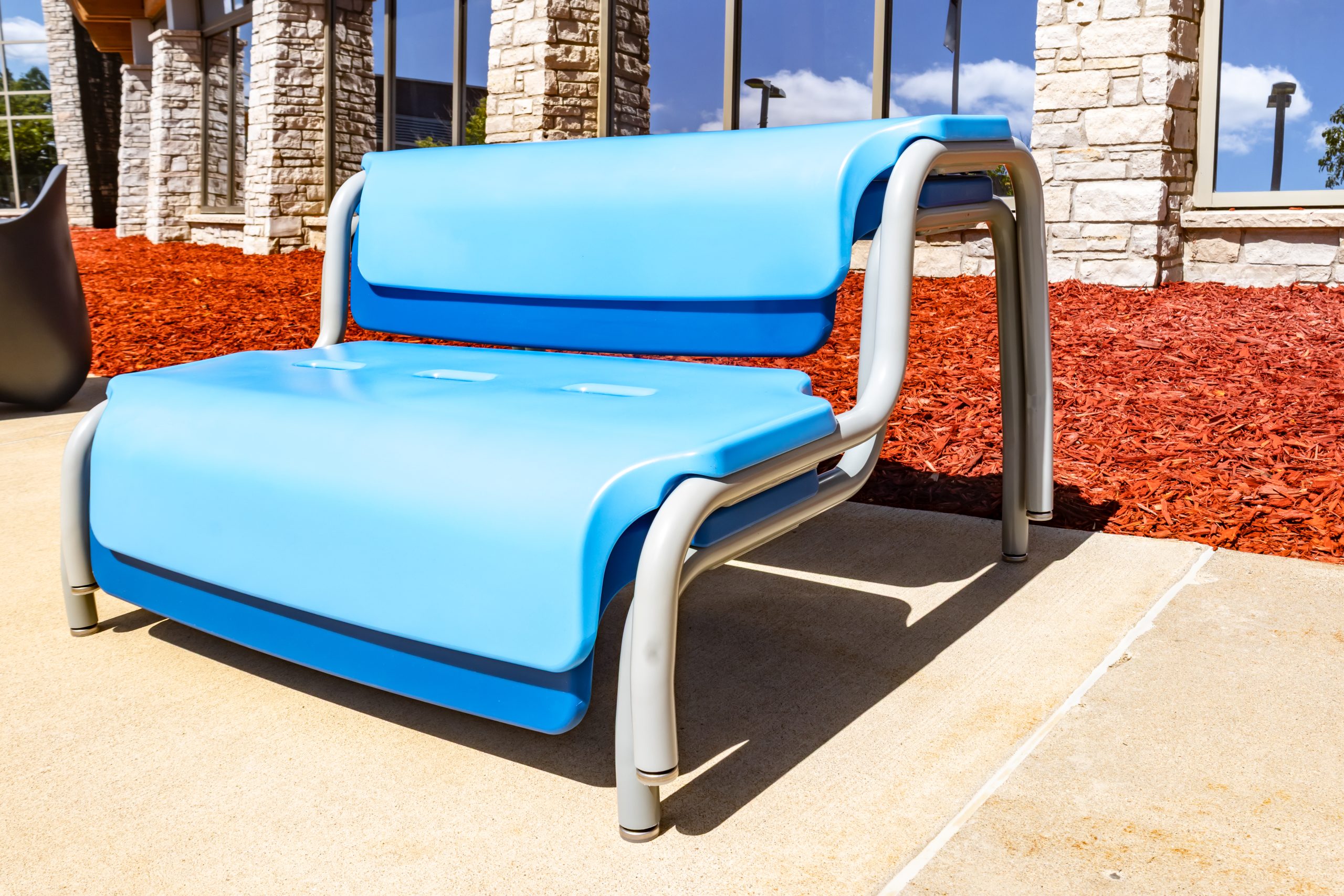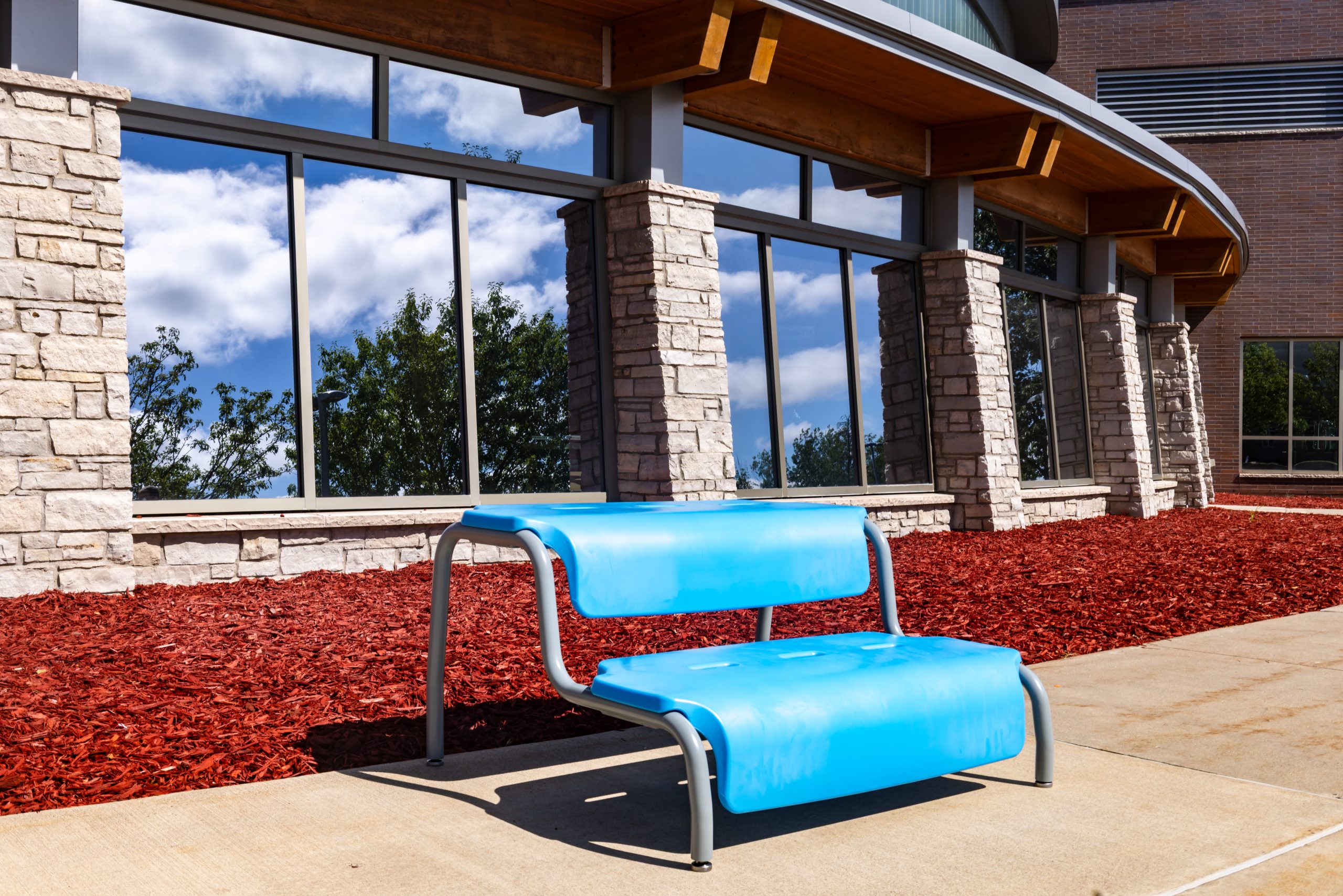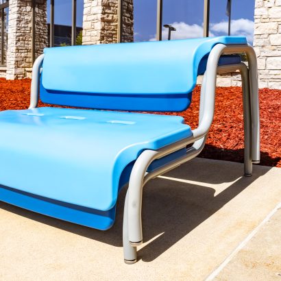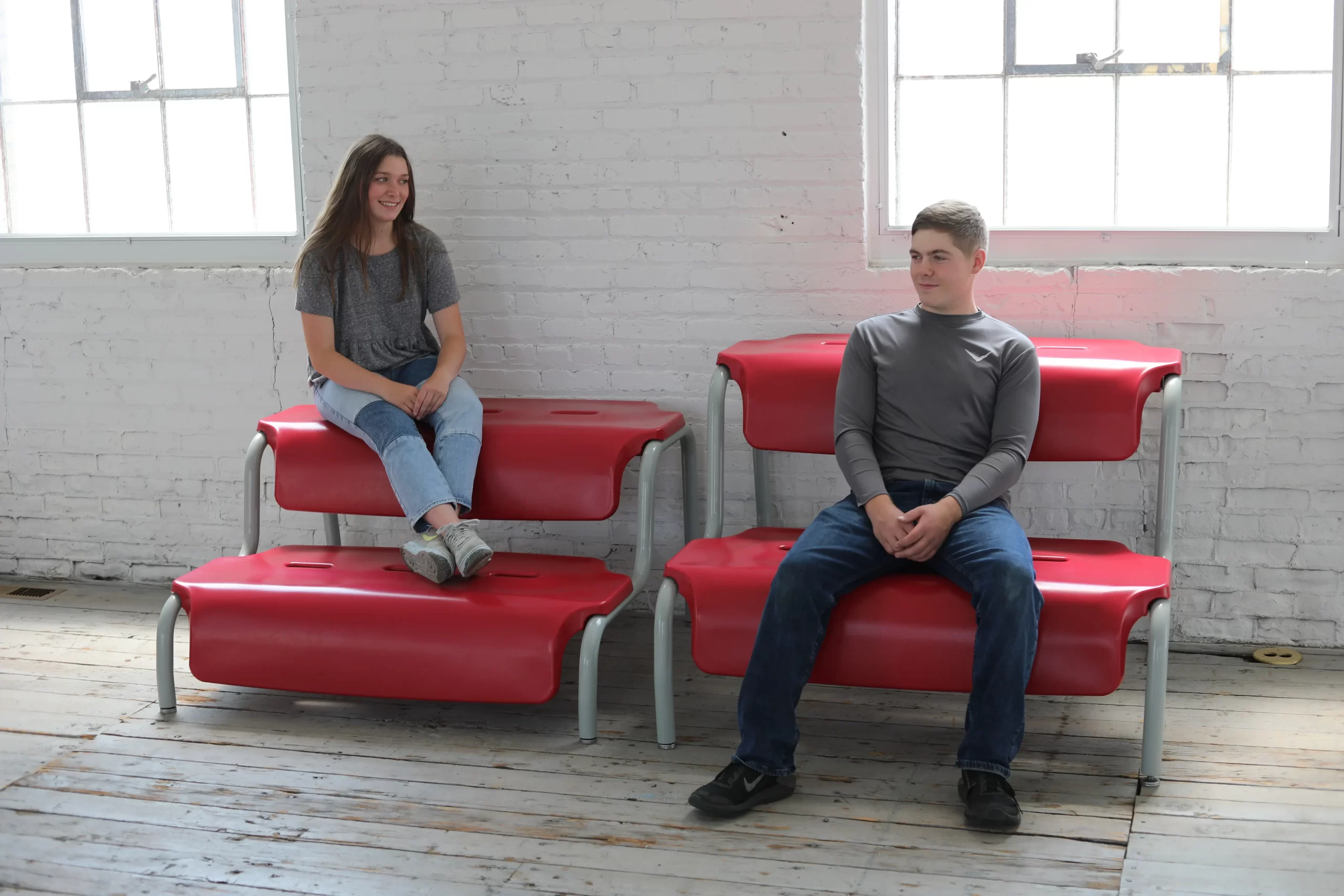 Elevate uses materials that are common in durable outdoor playground structures: hard polyethylene seats and powder coated steel frames. These materials hold up foot traffic and energetic students, while making sure sanitizing is a breeze. The open frame design ensures the cleaning crew can easily sweep underneath, while liquid spills and grime don’t get trapped behind or between the furniture. People are known to drop things and with Elevate it is easy to reach under the frame to retrieve dropped items. Our customers asked for seats that were extra wide so went with 47” wide seats and now two people can sit side-by-side without having to be crunched together. Customers wanted seating that could be moved, stacked, and easier to fit through doorways – Elevate delivers and you can even stack two units to make some extra space when needed. If you desire cushioning we sized the Tenjam Rad Pad cushion to perfectly fit on the Elevate Seats and you can store the Rad Pads under the Elevate frame.
