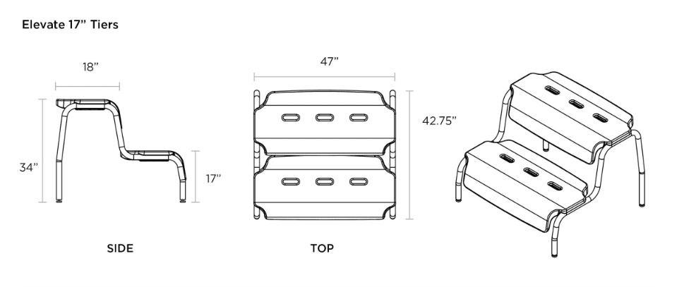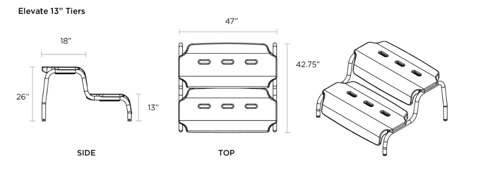 Elevate is available in one size: 47” Width x 42” Depth with 13” Tier Heights (26” Total Height), approx. 83 lbs